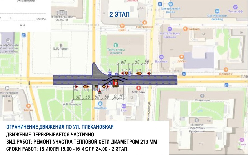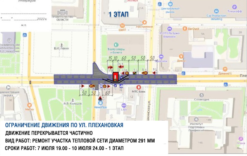 13.07.2023 В связи с производством АО «Квадра» работ по ремонту участка теплосети протяженностью 80 метров будет частично, в два этапа, перекрываться движение автотранспорта в районе театра оперы и балета:- - с 19:00 7 июля до 24:00 10 июля – будет закрыт проезд по четырем полосам улицы с перенаправлением потока на встречную полосу со стороны театра оперы и балета по нечетной стороне улицы Плехановской. Движение на этот период будет осуществляться согласно схеме № 1;