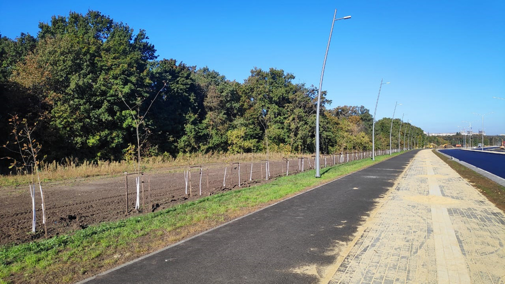 Параллельно подрядной организацией выполняется необходимое благоустройство. В частности, начато озеленение вдоль дороги. Проектом предусмотрена высадка более 1600 саженцев рябины и клена, однако фактически зеленых насаждений будет больше. Подрядчик дополнительно высадит еще 500 крупномерных саженцев и 3300 кустарников. Также, согласно контракту, в течение следующего года им будут выполняться уходные работы.