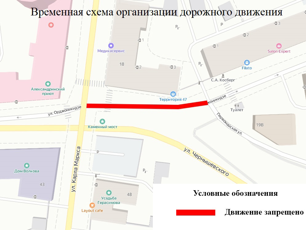 21.03.2024 В связи с производством противоаварийных работ в отношении объекта культурного наследия регионального значения «Каменный мост» завтра, 22 марта, с 9:00 до 16:00 будет закрыто движение на участке улицы Орджоникидзе – от улицы Карла Маркса до улицы Первомайской.