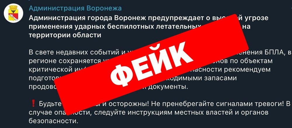 10.04.2024 Этот скрин – фейк, будьте внимательны! В СМИ в целях создания паники вбрасываются такие картинки, создаются фейковые аккаунты администрации и ее сотрудников. Обращаем внимание, что злоумышленники стараются сделать их максимально похожими на оригинальные: подбирают схожие адреса и копируют фирменное оформление.Телеграм-канал администрации можно найти по адресу @ADM_VRN.
