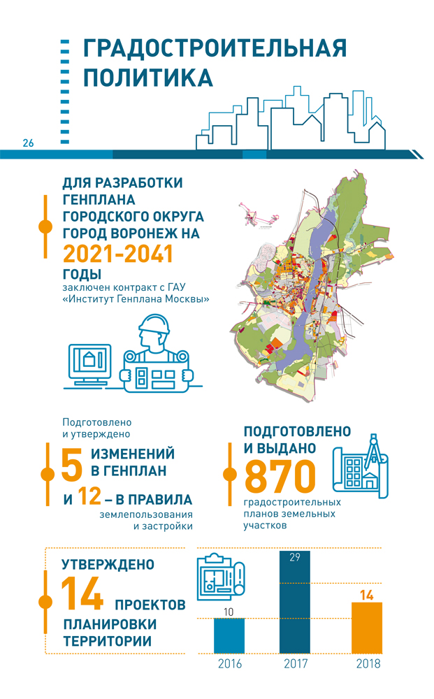Переходя к роли органов власти, Вадим Кстенин отметил, что документы территориального планирования постоянно поддерживаются в актуальном состоянии. Так, в прошлом году администрация совместно с Воронежской городской Думой подготовили и приняли 5 изменений в Генплан, 12 изменений в Правила землепользования и застройки, 14 проектов планировки территории. Заключены контракты и начата разработка нового Генплана на период до 2041 года и новой Комплексной схемы организации дорожного движения на период до 2032 года.