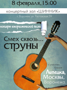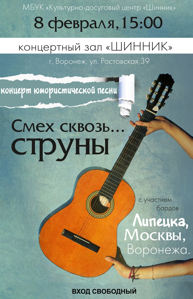 Культурно-досуговый центр «Шинник» приглашает всех желающих зарядиться позитивом и отличным настроением на творческую программу «Смех сквозь струны», где барды Воронежа, Липецка и Москвы исполнят самые остроумные песни нашего и прошлого века.