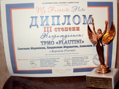 Трио «Флаутини» в составе Маренковой Светланы, Мерцаловой Владиславы, Корязиной Анжелики (преподаватель Коломыцева Ксения Сергеевна, концертмейстер Уварова Евгения Евгеньевна) МБОУДОД Детская школа искусств № 9 городского округа город Воронеж завоевало диплом лауреата III степени.