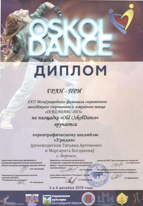 Гран-при фестиваля на площадке «Old OskolDance» завоевал хореографический ансамбль «Э’ридан» ДШИ № 9, руководители Татьяна Артеменко и Маргарита Богданова. Высшие баллы получили все 9 танцев, продемонстрированные взыскательному жюри, членами которого были: Евгений Раев - профессиональный танцор, бронзовый призёр чемпионата мира, чемпион Америки, трёхкратный финалист чемпионата мира, бронзовый призёр чемпионата Голландии и чемпионата Англии; Марта Носова, актриса, чемпионка мира по спортивным танцам; Павел Ивойлов - артист Старооскольского театра для детей и молодежи; Виктор Ганженко - Народный артист РСФСР, профессор кафедры хореографического творчества Белгородского государственного института искусств и культуры.
