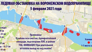 По результатам замеров, произведенных спасателями городской службы спасения 5 февраля, толщина льда на акватории воронежского водохранилища варьируется от 0 до 35 см.