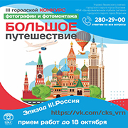 В Ленинском районе проходит, инициированный управой и организованный совместно с учреждением культуры «Централизованная клубная система», ежегодный III городской конкурс визуального искусства «Большое путешествие – 2022. Эпизод III. Россия».Главной целью онлайн-конкурса является укрепление межнациональной дружбы и согласия народов, населяющих Россию, создание условий для творческой самореализации воронежцев и в связи с проведением в Российской Федерации Года культурного наследия России.