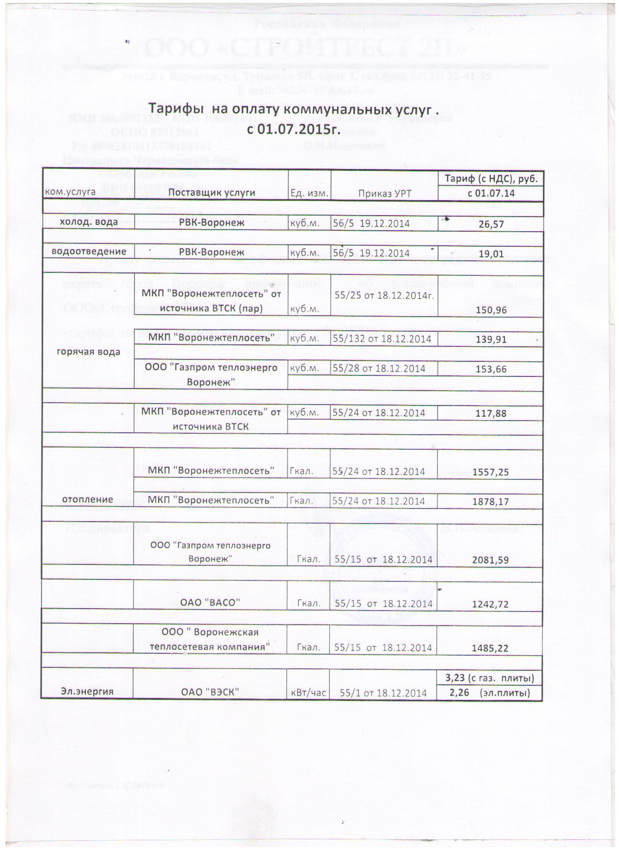 - ООО «Воронежская Лифтовая Компания» (Техническое обеспечение и ремонт лифтов) ОАО «ВАСО» (Отпуск горячего водоснабжения)