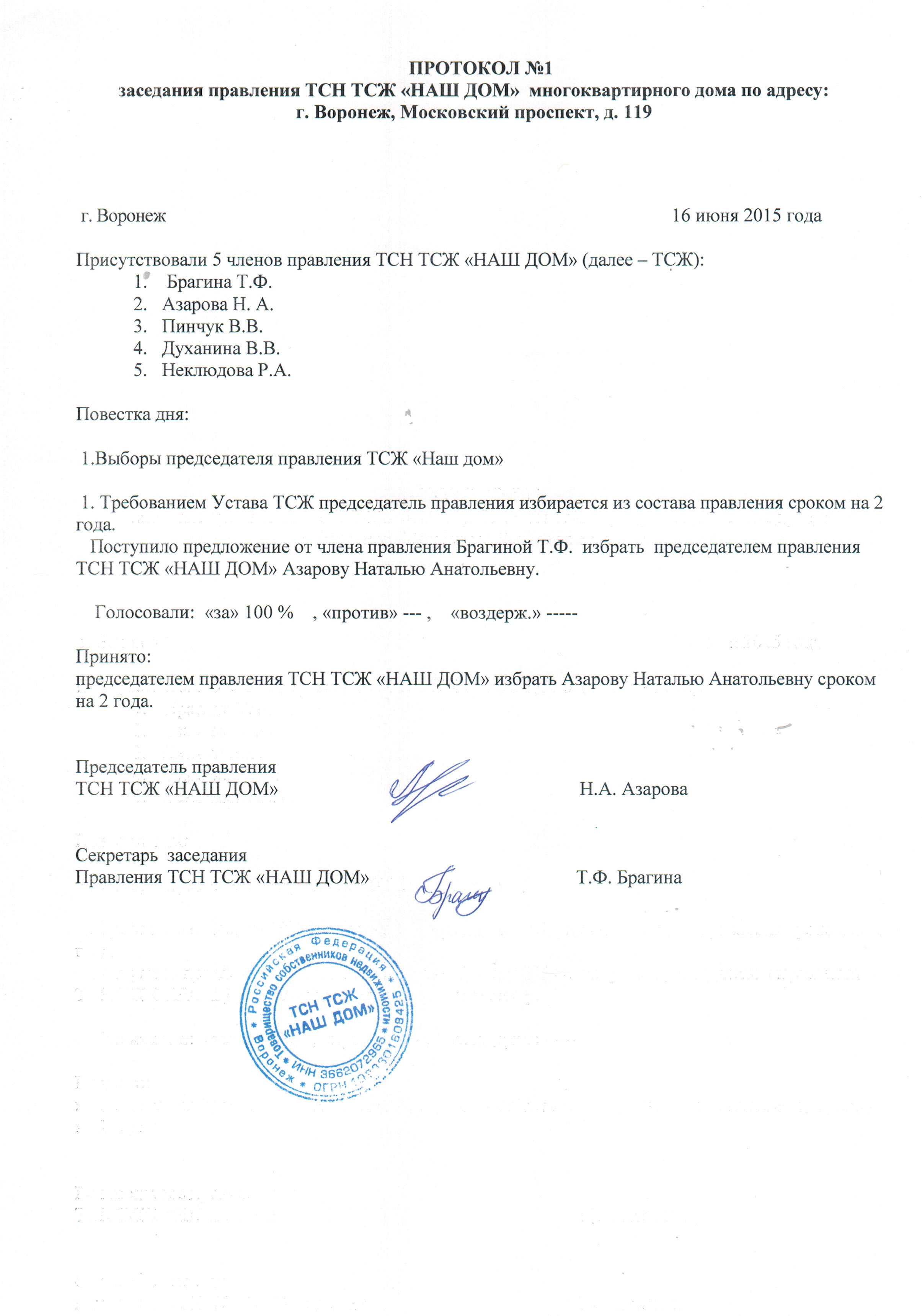 13.04.2012Председатель правления ТСЖ «Наш дом» - Азарова Н.А.