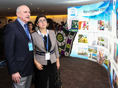 Перед началом мероприятия делегации ознакомились с экспозицией выставки, которая рассказывала о работе форума в прошлые годы, представляла российский Воронеж и таджикский Куляб в качестве культурных столиц СНГ будущего года.