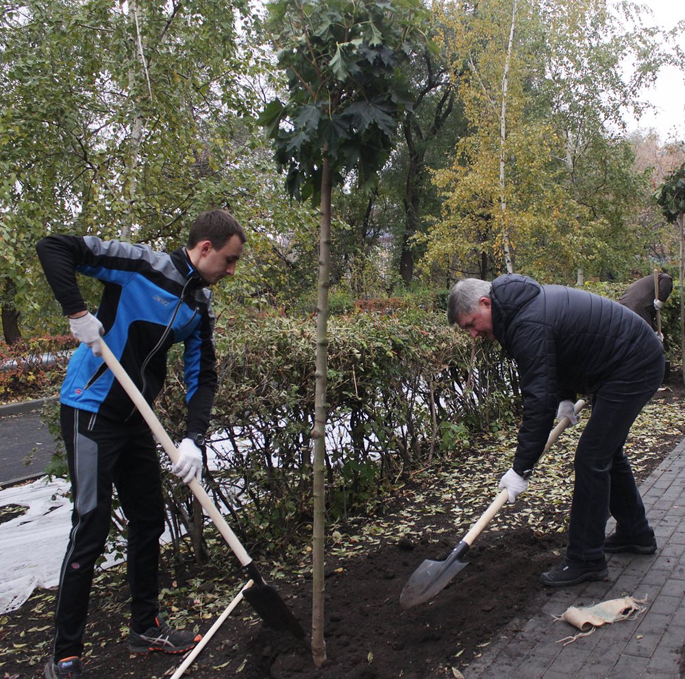 Вместе с сотрудниками управлений экологии, главного архитектора и городского молодежного совета Александр Гусев посадил 50 крупномерных саженцев с комом земли остролистного клена Глобозум.