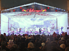 Открылся праздник ярким новогодним представлением «12месяцев», которое больше всего понравилось детям. Затем публика вместе с выступающими спела новогодние песни, а студия современного танца исполнила хореографические композиции. Также зрители смогли увидеть световое и лазерное шоу.