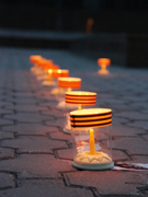 После объявленной минуты молчания, состоялась церемония возложения цветов к братской могиле и зажжение свечей.