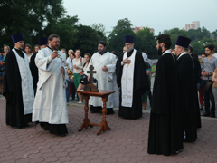 Акция началась с того, что священнослужители провели панихиду в память обо всех погибших на полях сражений. После этого диктор объявил минуту молчания.