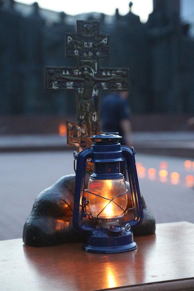 Далее под фонограмму песни «Вставай, страна огромная» все участники акции возложили цветы к вечному огню на Могиле Неизвестного Солдата, а также оставили лампады с благодатным огнем у подножия памятника, выложив ими слово «ПОМНИМ»