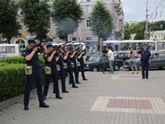 После гимна Российской Федерации и оружейных залпов мимо участников церемонии прошествовала рота почетного караула Военно-воздушной академии имени профессора Н.Е. Жуковского и Ю.А. Гагарина. Курсанты несли российский триколор, флаги Сухопутных войск, Воздушно-космических сил и Военно-морского флота.