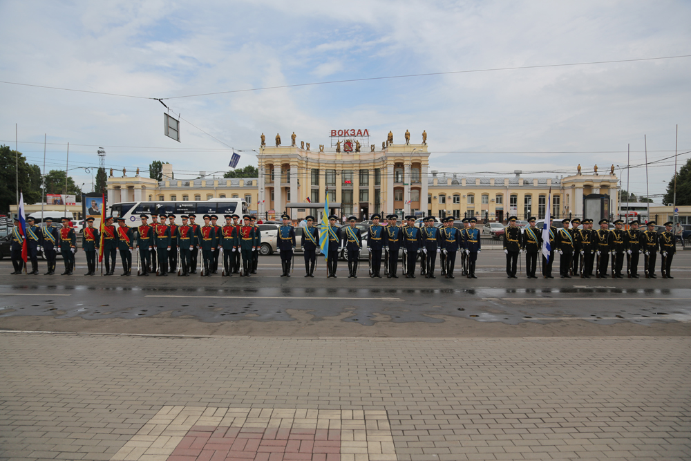 После гимна Российской Федерации и оружейных залпов мимо участников церемонии прошествовала рота почетного караула Военно-воздушной академии имени профессора Н.Е. Жуковского и Ю.А. Гагарина. Курсанты несли российский триколор, флаги Сухопутных войск, Воздушно-космических сил и Военно-морского флота.