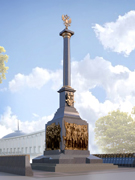Для справки: Мемориальный комплекс представляет устремленную ввысь гранитную стелу с капителью дорического ордера, увенчанную двуглавым орлом. Колонна установлена на гранитный пьедестал, украшенный бронзовым картушем с посвящением городам воинской славы. На декоративных гранитных стелах, обрамляющих с обеих сторон площадь вокруг стелы, высечены названия всех городов воинской славы. По четырем сторонам стелы расположены четыре бронзовых барельефа с фигурами воинов разных эпох.