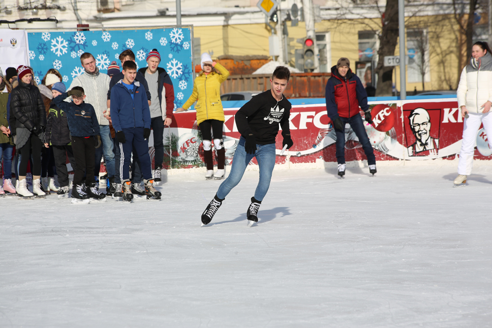 В 12:00 на площади Ленина начались спортивно-развлекательные игры. Зрители смогли увидеть показательные выступления от хоккеистов команды «Буран». Они совместно с воспитанниками городской детско-юношеской спортивной школы им. В.Третьяка продемонстрировали свои навыки и умения. А после на катке начались эстафеты, в которых приняли участие все желающие, кто в этот день пришел на площадь. Борьба за победу была сложной – ребятам пришлось выполнять различные элементы фигурного катания под руководством опытного тренера.