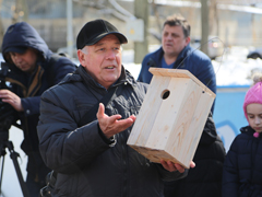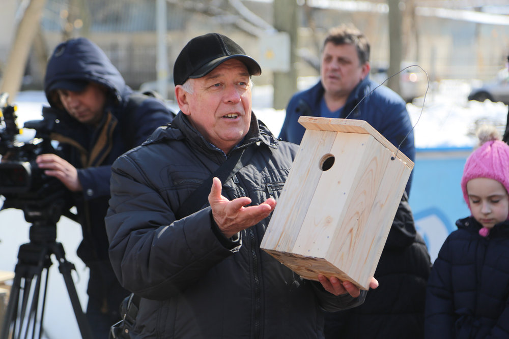 С интересным рассказом о роли птиц выступил приглашенный орнитолог Олег Киселев. Он рассказал присутствующим о том, что скворечники в парках необходимо крепить на высоте не менее 5 метров, чтобы птице было комфортнее в оживлённом парке, и не ближе трех метров, чтобы птицы не конфликтовали. Кстати, скворечник нужно не только повесить на правильной высоте, но и с правильным уклоном – для комфортного размещения птенцов.