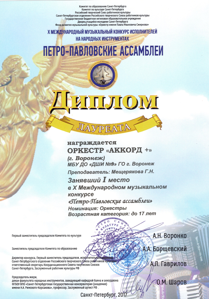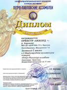 Оркестр «АККОРД+», руководитель Галина Мещерякова, пройдя конкурсные испытания, по результатам 1-го и 2-го туров стал лидером, обойдя своих сверстников из Москвы и Санкт-Петербурга, завоевал диплом лауреата 1 степени и получил сертификаты на приобретение музыкальных инструментов. Все 13 членов жюри из России, Белоруссии, Испании, Финляндии высоко оценили творчество юных музыкантов. Директор конкурса, заслуженный артист России, профессор, декан факультета народных инструментов Санкт-Петербургской консерватории им. Н.А. Римского-Корсакова, член-корреспондент Петровской академии наук и искусств О.М. Шаров вручил руководителю коллектива благодарность за подготовку лауреата 1 степени.