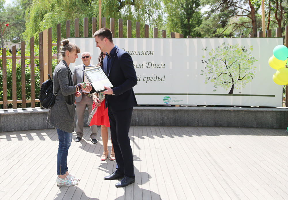 Заместитель главы администрации городского округа город Воронеж Алексей Антиликаторов на сцене летнего театра торжественно наградил лауреатов премии главы городского округа город Воронеж в области охраны окружающей среды.