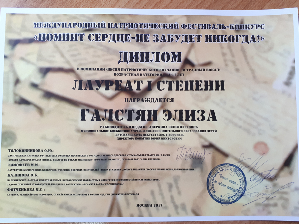 В нем приняли участие учащиеся вокального отделения детской школы искусств № 9 Воронежа. В номинации «Вокальное искусство. Эстрадный вокал» лауреатом 1 степени стала Элиза Галстян (класс преподавателя Юлии Аверкиной). Диплом лауреата 3 степени получила Александра Сенцова (класс преподавателя Заслуженного работника культуры РФ Светланы Татьянченко).