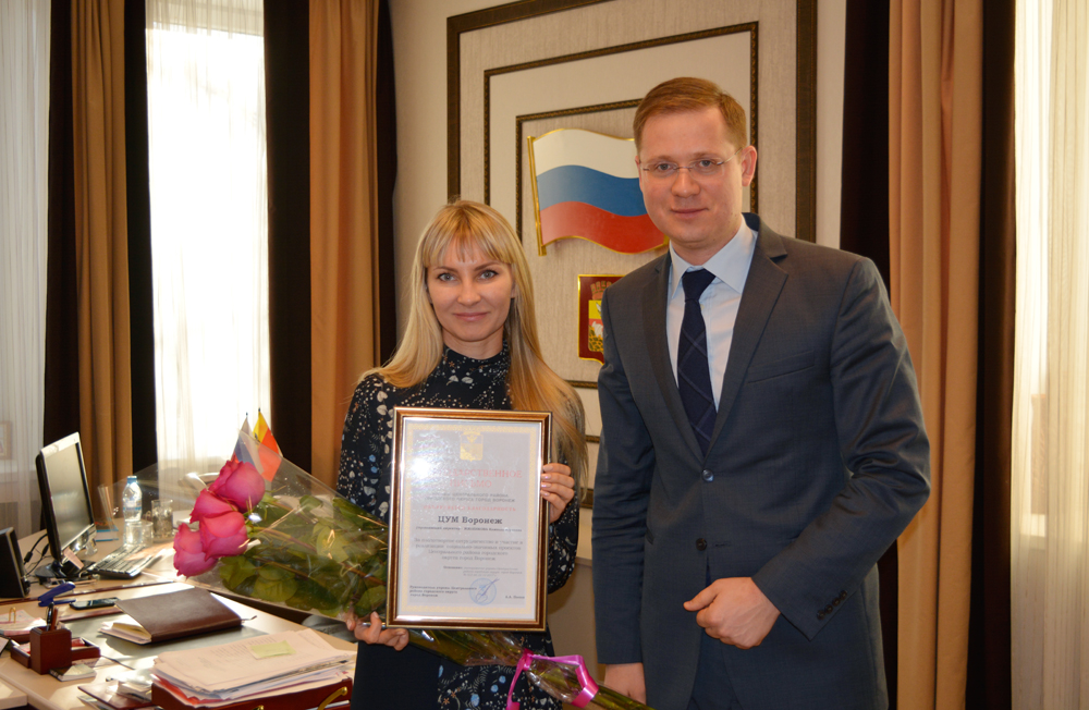 Руководитель управы Центрального района Александр Попов поблагодарил руководство ЦУМ Воронеж за новогоднее оформление здания и прилегающей территории, а также за инициативу и креативный подход в создании праздничного настроения жителей и вручил благодарственное письмо.