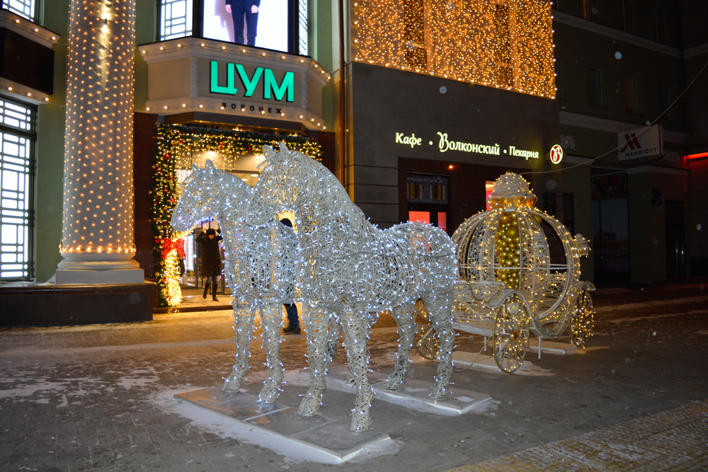 На проспекте Революции у здания ЦУМ Воронеж появилась световая композиция в виде кареты с лошадьми, которая очень понравилась горожанам и получила большой положительный отклик у населения. Жители отмечали, в том числе и в социальных сетях, что на сегодняшний день это лучшее праздничное оформление в городе.