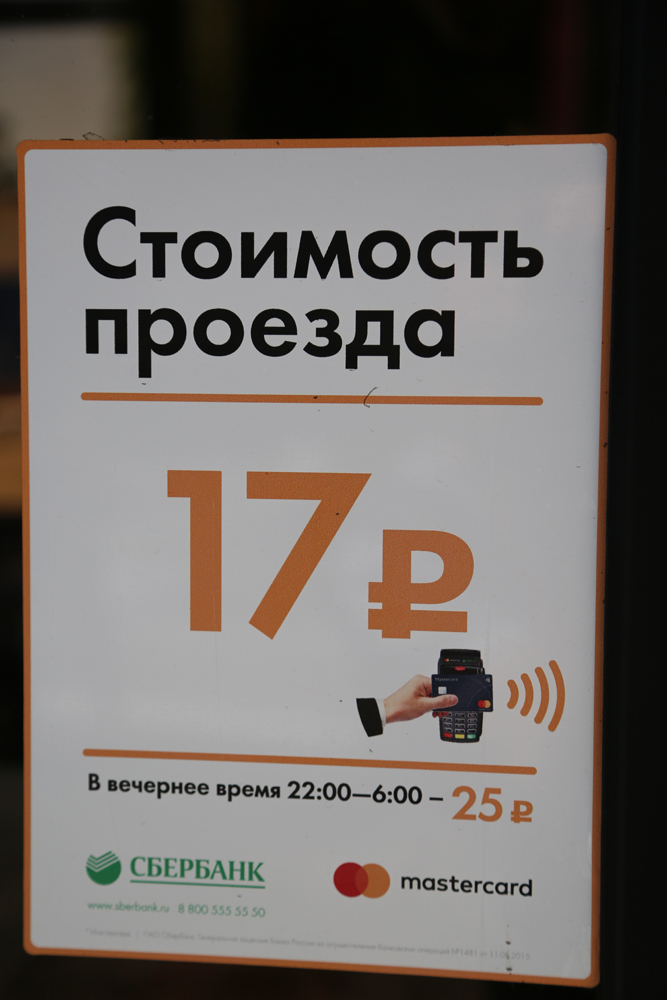 Терминалы для безналичной оплаты проезда установлены около водителя. Оплатить проезд можно любой банковской картой (Visa, MasterCard, МИР) любого банка Российской Федерации или гаджетами (смартфон, умные часы и т.д.), поддерживающими технологию бесконтактной оплаты, кроме карты Maestro. По этому поводу, заместитель председателя ЦЧБ ПАО Сбербанк Александр Закурдаев сообщил, что эти карты можно будет бесплатно заменить в любом офисе Сбербанка на бесконтактную карту МИР.