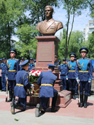 Под звуки гимна Российской Федерации, исполненного военным оркестром, и оружейные залпы курсанты роты Почетного караула сняли покрывало, и бюст предстал перед глазами участников церемонии. Все желающие смогли возложить венки и цветы к памятнику.