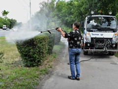 поливают деревья и кустарник, высаженные вдоль магистральных улиц. Кроме классического полива, оператор МКМ промывает весь массив кустарника, освобождая его от пыли, что в свою очередь придает зелени благоприятный внешний вид и способствует здоровому росту.
