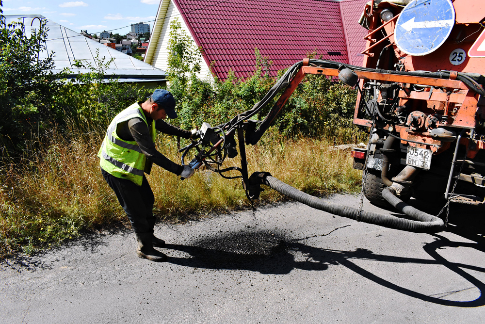 Работы проводятся Комбинатом благоустройства Ленинского района с применением специальной коммунальной техники - машины для ямочного ремонта Р-310М. Такая машина предназначена для рационального и качественного ремонта дорожных покрытий с помощью щебня различных фракций и эмульсии.