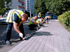 Участники сводной бригады районного Комбината благоустройства также пожертвовали своим выходным днем и красили бордюры на транспортной развязке Петровская набережная, 20-летия Октября, Грамши; ул. Кольцовская.