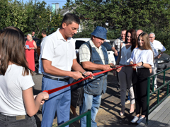 Глава управы Ленинского района и председатель уличного комитета под бурные аплодисменты собравшихся перерезали символическую ленту и подписали документ о передаче объекта в пользование и владение жителям ТОС.