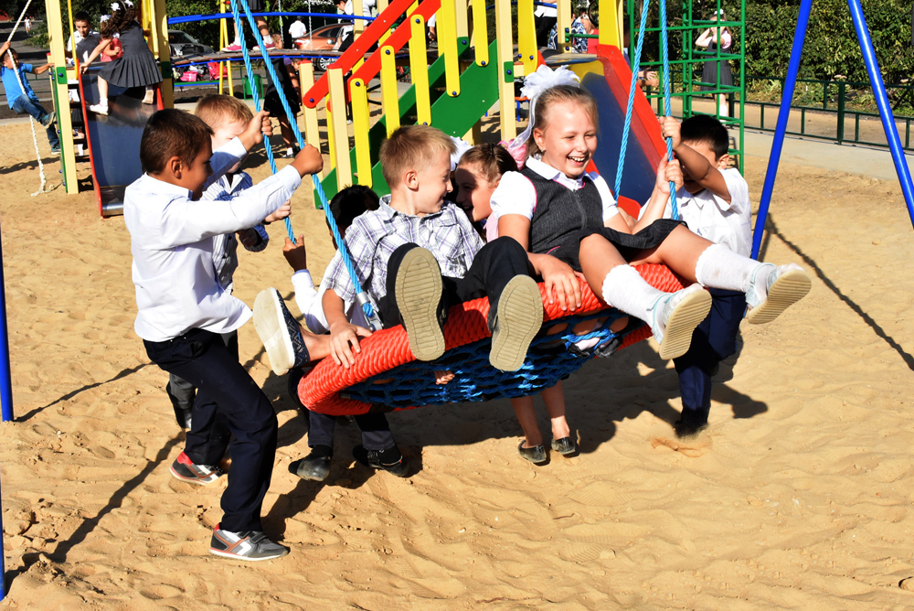 Тем временем малыши с удовольствием резвились на долгожданных качелях и каруселях