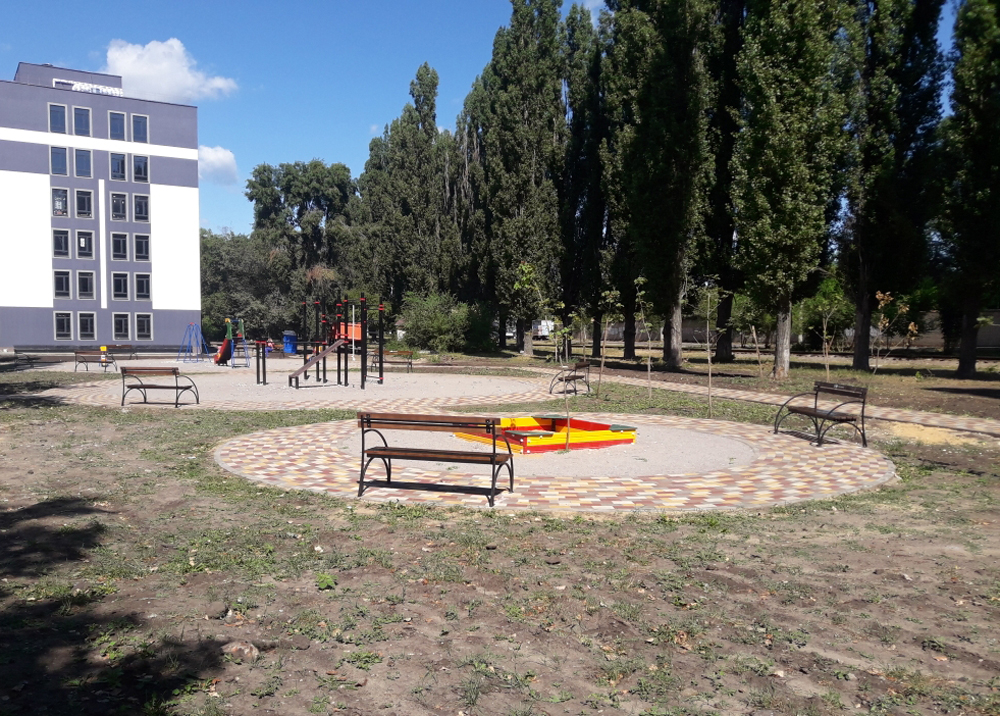 Сейчас работы по благоустройству подходят к концу. Местность выровнена, завезен грунт, установлены лавочки и урны, а так же детское игровое оборудование. Сквер пересекают разноцветные тротуарные дорожки.