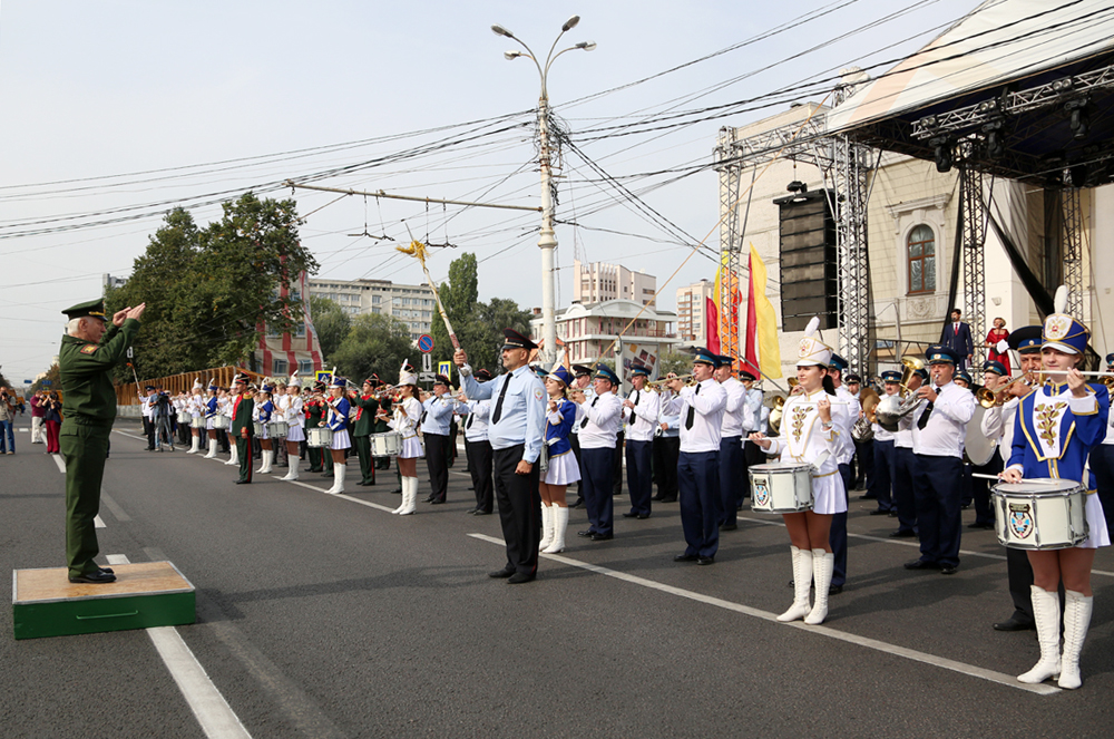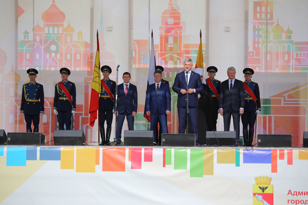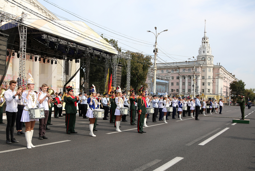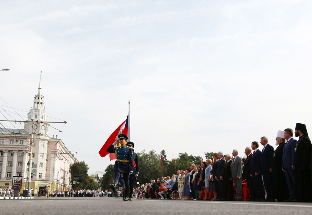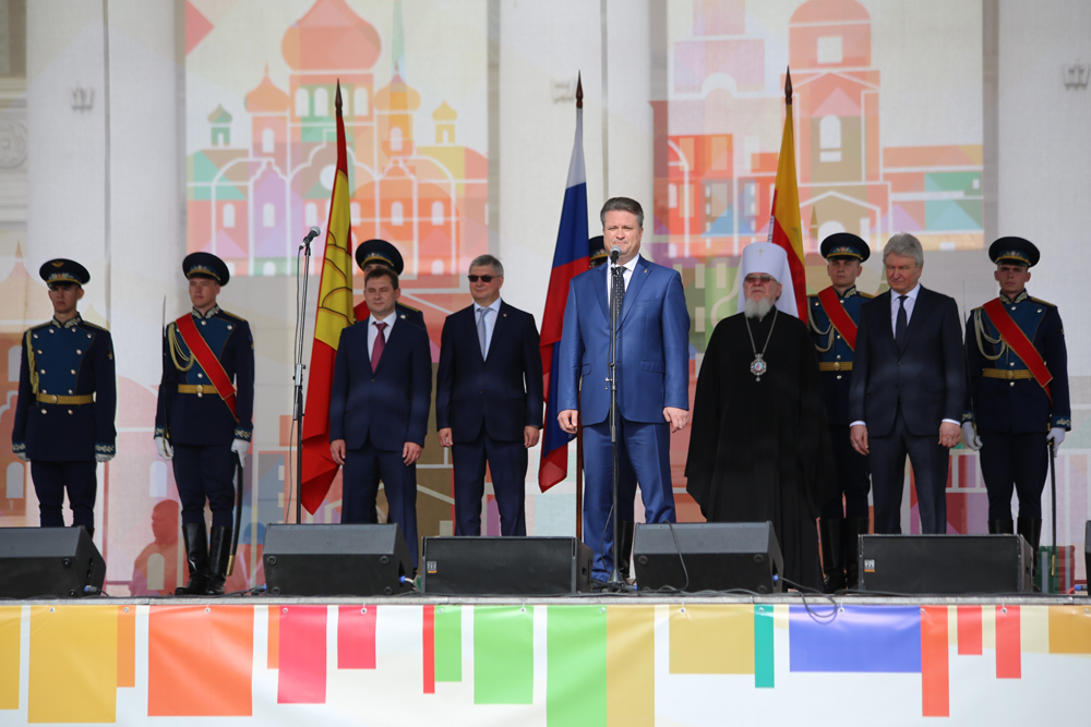 В 10:00 началась торжественная церемония открытия праздника – сводный духовой оркестр, которым дирижировал старший преподаватель Военного университета Министерства обороны РФ, Заслуженный артист России, полковник Александр Халилов. Музыканты исполнили произведения «Славься» и «Прощание славянки». В небо отправились десятки белых голубей, а на площадь Ленина знаменосцы торжественно внесли флаги Российской Федерации, региона и города.