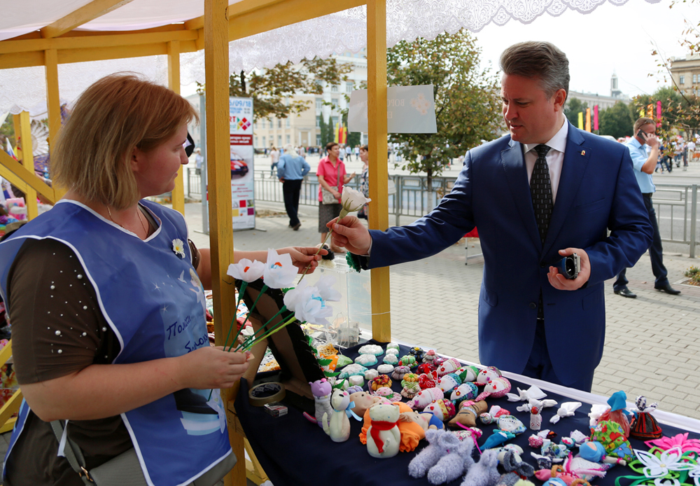 В течение дня в городе работают десятки площадок. Так, традиционно у входа в Кольцовский сквер развернулась выставка-ярмарка по сбору средств на лечение онкобольных детей «Белый цветок» в рамках «Недели добра и милосердия». Глава Воронежа Вадим Кстенин посетил это благотворительное мероприятие и приобрел сувениры и цветок.