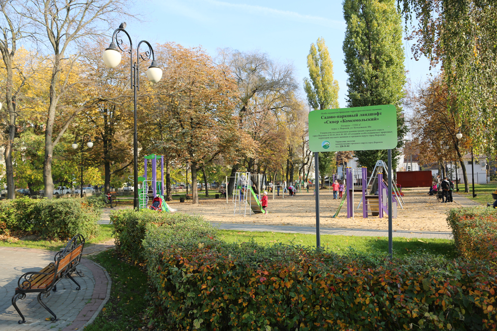 Сквер «Комсомольский» находится на территории Ленинского района по адресу: ул. Кольцовская, 68в. Общая площадь составляет 18 179 кв. м.