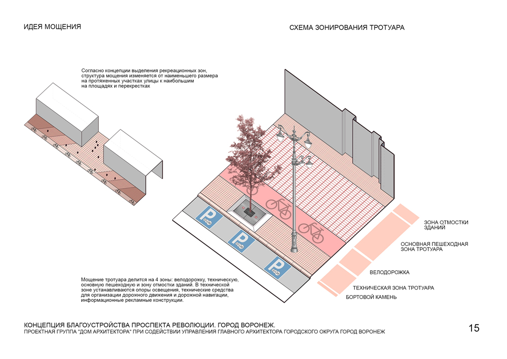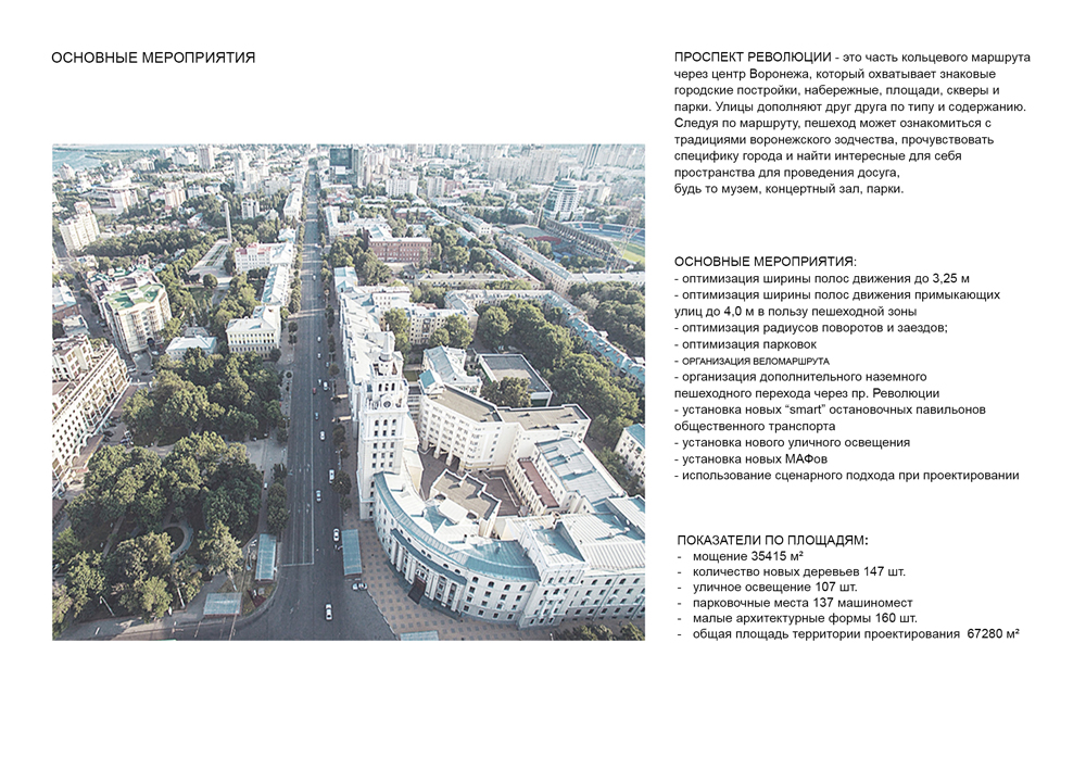 Современный проспект Революции – это сосредоточение транспортных потоков, многочисленных пешеходных маршрутов, а также место концентрации главных городских событий. Примыкающие к улице общественные пространства – площади и скверы, а также размещение на ней культурно-развлекательных и гастрономических заведений, делают ее не только транзитной, но и привлекательной для горожан и гостей Воронежа.