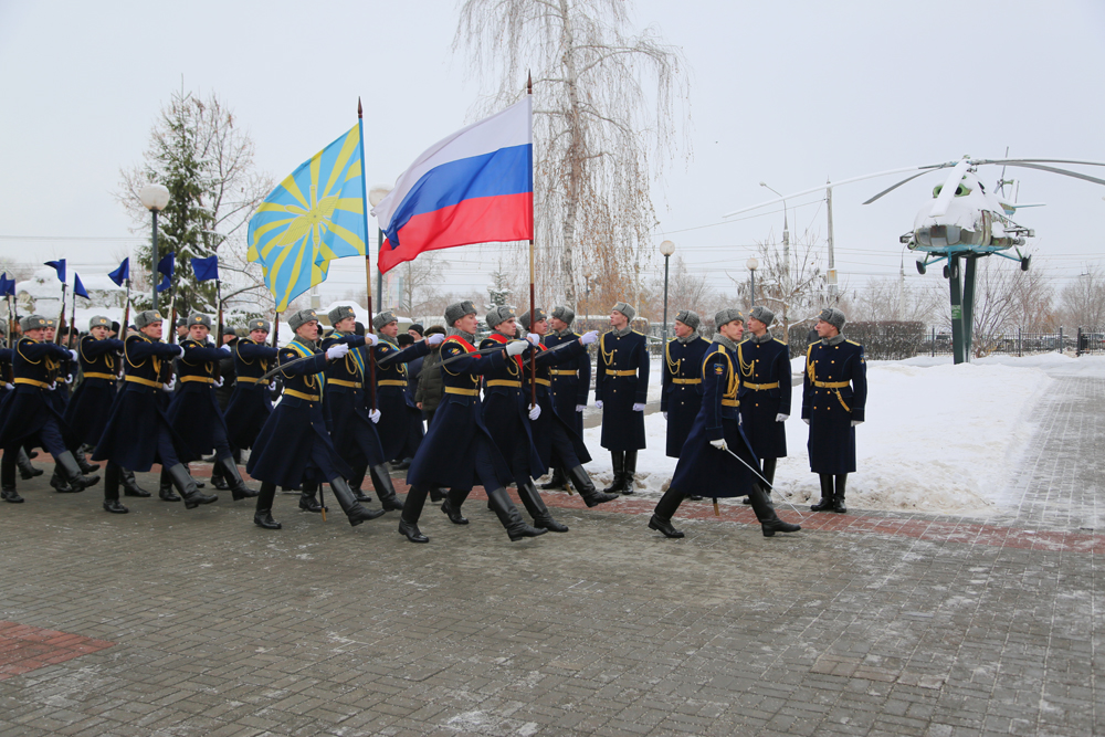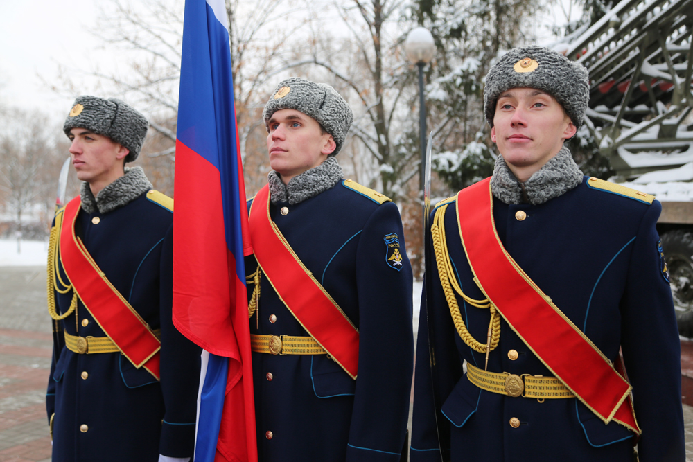 Под залпы оружейного салюта военный оркестр исполнил гимн Российской Федерации, а почетный караул курсантов прошел торжественным маршем.