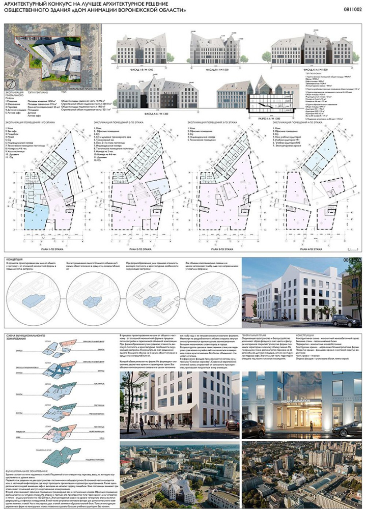 С учетом сложившейся застройки и архитектурным стилем квартала города участники выполнили архитектурные решения общественного здания «Дом анимации воронежской области» по адресу г. Воронеж, ул. Куколкина, 3, предложили функциональное зонирование территории и оригинальные архитектурные облики объекта.
