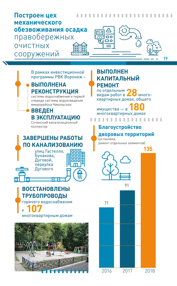 Построены цех механического обезвоживания осадка правобережных очистных сооружений, Сочинский коллектор. Также «РВК-Воронеж» ведет работу по ремонту и реконструкции сетей, близится к завершению строительство «Квадрой» парогазовой установки, «МРСК Центра» запроектировал подстанцию 110/10 кВ «Спутник».