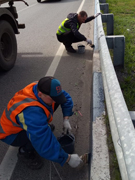 В ходе работ малая коммунальная техника и работники ручной уборки отмывают бортовой камень и металлические ограждения от грязе – соляных отложений, а затем производится покраска.