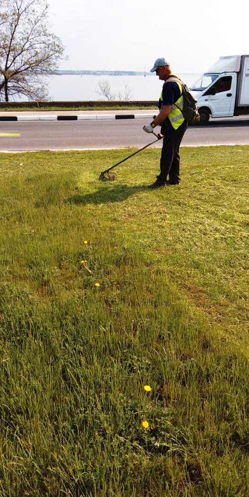 С использованием мотокос типа STIHL FS250 и Husqvarna операторы косят траву на газонах, в парках, скверах и других озелененных территориях.