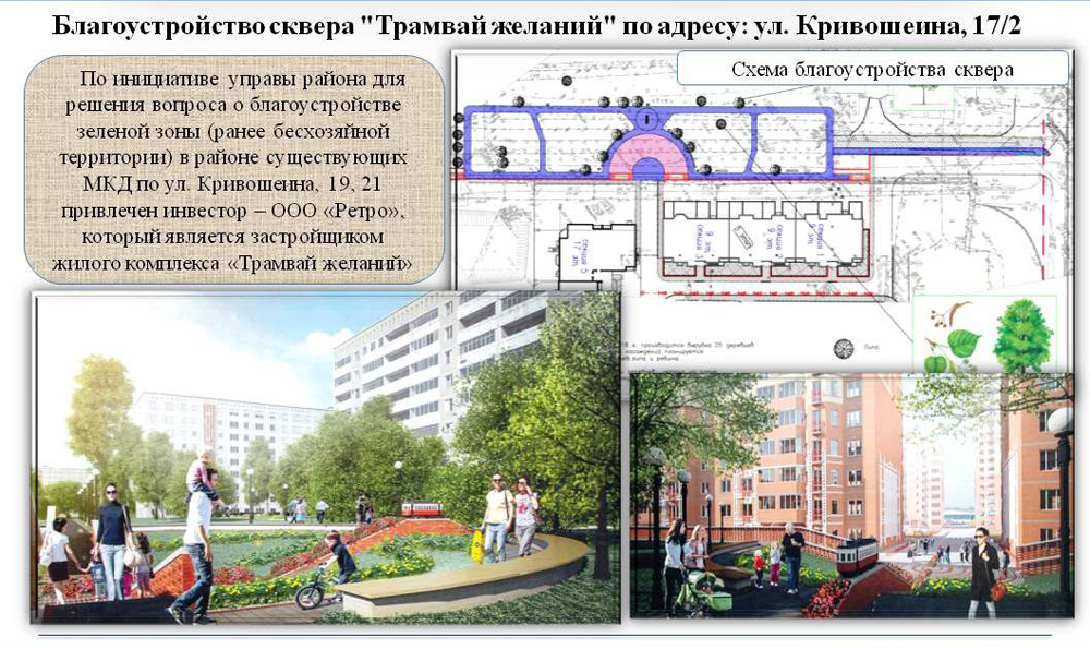 Современный сквер «Трамвай желаний» скоро появится в районе существующих многоквартирных домов по ул. Кривошеина, 19, 21 и вновь возводимого жилого комплекса.
