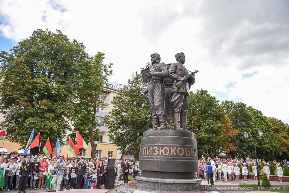 Имена Евгения, Александра и Петра Лизюковых особенно почитаемы на белорусской земле, и открытие памятного знака, посвященного легендарным братьям, для гомельчан - знаковое и значимое событие. Памятник был создан белорусским скульптором Валерием Кондратенко, который, по его словам, стремился не просто передать полное портретное сходство, но и сделать акцент на героической биографии братьев-гомельчан. Так, старший из братьев, руководитель партизанского отряда Евгений, запечатлен с автоматом в руках, командарм танковой армии Александр держит планшет с картой окрестностей Воронежа, а младший Петр – командир истребительно-противотанковой артиллерийской бригады – исполнен с биноклем в руках.