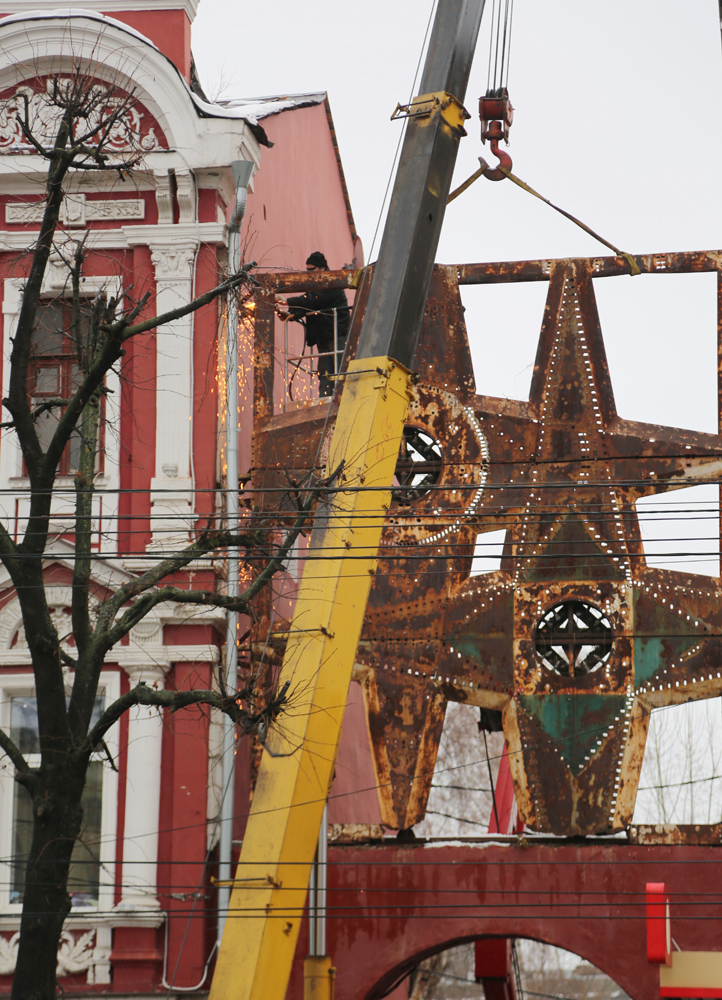 Напомним, в декабре 2018 года модуль в виде звезд, расположенный в проездной арке между домами 47 – 49 на проспекте Революции был демонтирован. Демонтаж был осуществлен после проведения экспертного исследование объекта специализированной организацией, в ходе которого установлено, что конструкция в процессе длительной эксплуатации пришла в аварийное состояние.