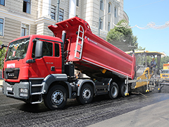 На укладке верхнего слоя покрытия из щебёночного-мастичного асфальтобетона было задействовано сразу два асфальтоукладчика и шесть катков. Был организован бесперебойный подвоз на место работ асфальтобетонной смеси специальными самосвалами (всего их потребовалось около 130).