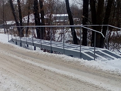 Для удобства жителей подрядчик установил на сваи металлическое пешеходное основание и перила. Кроме того, мост был приподнят над проезжей частью для безопасности пешеходов.